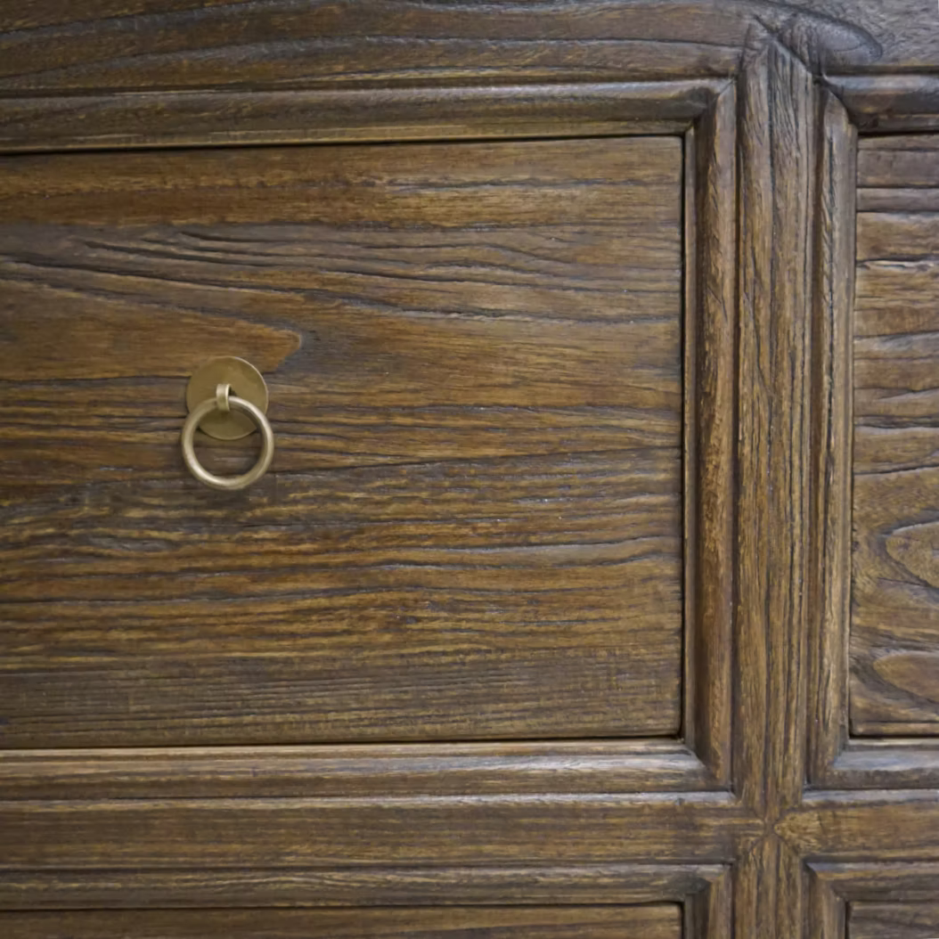 Le design du buffet Reid privilégie la fonctionnalité, offrant une série de tiroirs qui procurent un espace de rangement généreux. Les ferrures en bronze ajoutent une touche d'élégance et complètent l'aspect rustique du bois, créant un contraste visuel harmonieux.