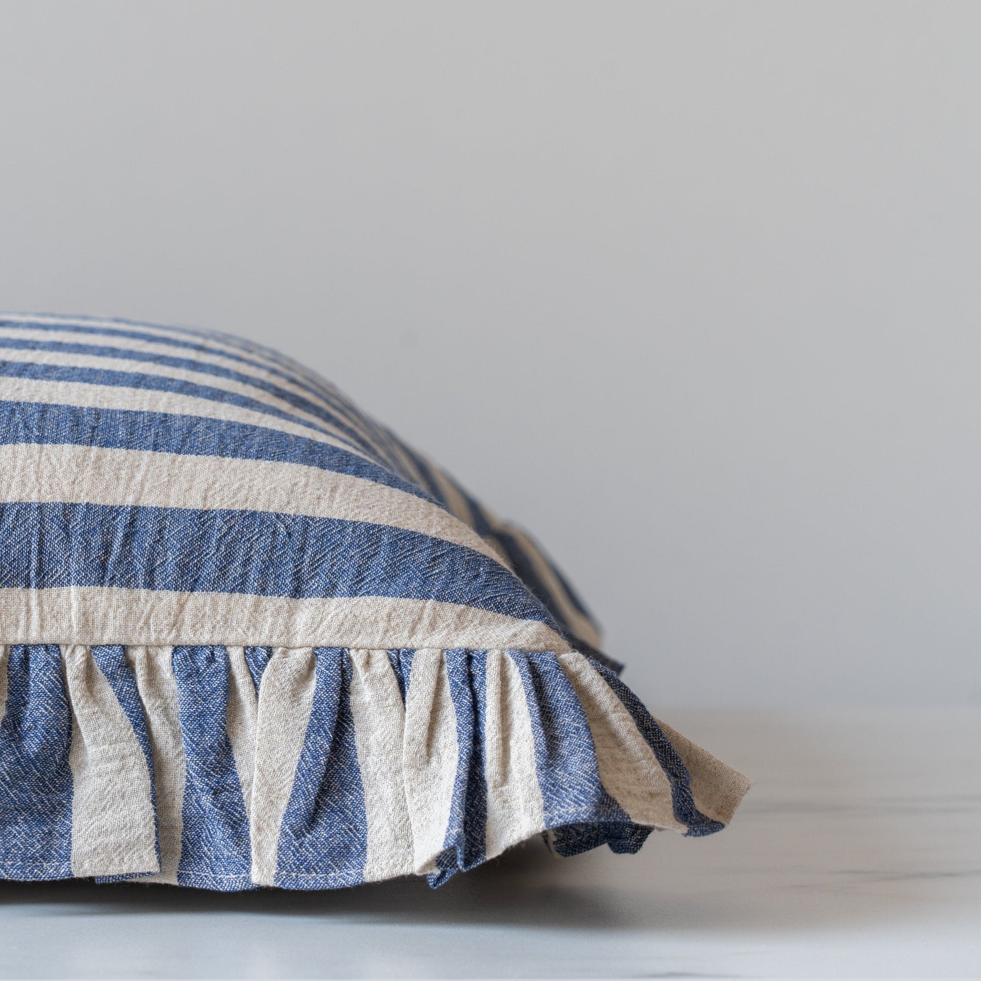 Vous raffolez des volants ? Nous aussi ! C’est pourquoi nous sommes ravis de vous présenter notre nouvelle housse de coussin Harland. Ses rayures classiques bleues et beiges, rehaussées d’une délicate bordure à volants, créent une ambiance champêtre française intemporelle. Confectionnée avec amour dans notre atelier par notre équipe, cette housse est produite en petites séries, les quantités sont donc limitées.